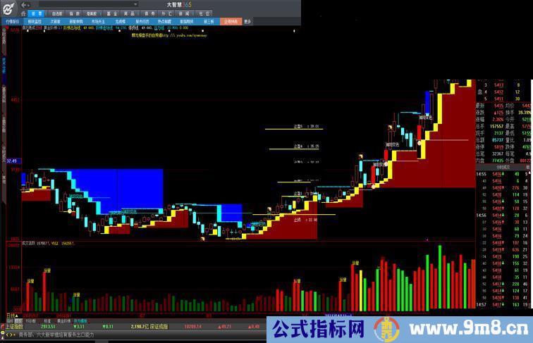 1.收盘价在黄色阶梯出场线上方表示短期上涨趋势,应伺机买入。