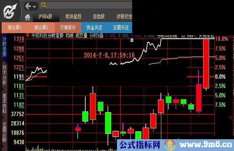 本指标就是针对上述问题编写的一个指标,在分时主图中加入了近10多个交易日的K线图,这样在查看分时主图时,就能够在不进行任何切换操作的情况下查看近来K线走势图以及自己专用的各个分时副图。