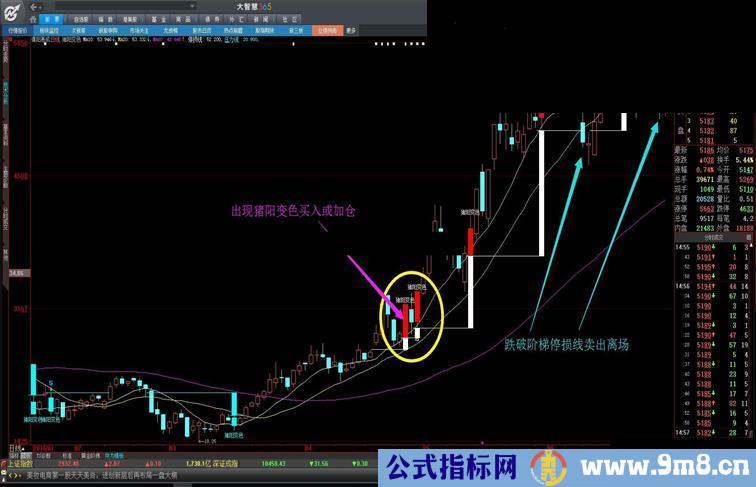跟上次给大家分享的带有四个参数的“黄金阶梯”指标相比,“猪阳变色”指标因为引入了个股本身三条重要均线的碰撞,所以,红色K线的“猪阳变色”往往出现在一波上涨后回踩重要均线之后的再次拉起,底分型确立时的比较确切的买入点,这和“缠论”的二买位或三买位不谋而合,而停损的设置一般也就是那根比较重要的“猪阳变色”K线的震幅(10%~15%),并且随着股价的盘升,指标可以自动把停损移动到下一次“猪阳变色”K线的最低价,形成相对合理的移动阶梯出场策略,适合偏中线的持股用户选择使用。如果持股周期偏短,则可以使用“黄金阶梯”指标的参数1或参数2方案作为停损。