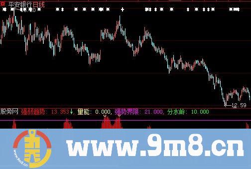 强弱趋势: EMA(100*(CLOSE-LLV(LOW,34))/(HHV(HIGH,34)-LLV(LOW,34)),3)/4, STICK,COLORRED; 量能: IF(强弱趋势 23.16,强弱趋势,0), CIRCLEDOT,coloryellow; 强势界限: 21; 分水岭: 10;