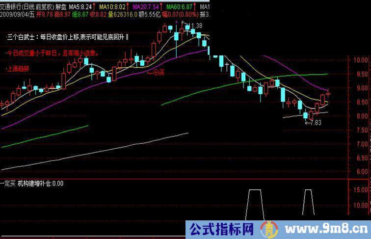 VAR1:=(3)*(SMA(((CLOSE - LLV(LOW,27))/(HHV(HIGH,27) - LLV(LOW,27)))*(100),5,1)) - (2)*(SMA(SMA(((CLOSE - LLV(LOW,27))/(HHV(HIGH,27) - LLV(LOW,27)))*(100),5,1),3,1)); 机构建增补仓:IF((VAR1 < 5),10,0);