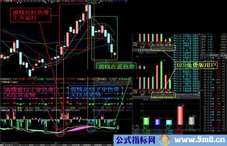 1:红色带表示上涨趋势,绿色带表示下跌趋势,黄线指示可操作程度;