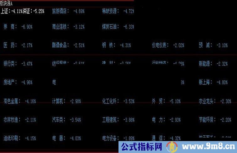 IF STKINDI('991037','涨幅引用.A')*100<0 THEN BEGIN DRAWTEXTREL(x3,y8,'电力设备: ' +NUMTOSTRN(STKINDI('991037','涨幅引用.A')*100,2)+'%'),colorb48c33;end;