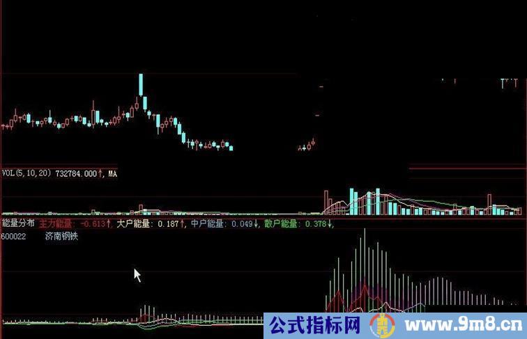 STICKLINE(主力能量>=0 AND 主力能量< REF(主力能量,1),0,ABS(主力能量),3,0),COLOR00FF00;