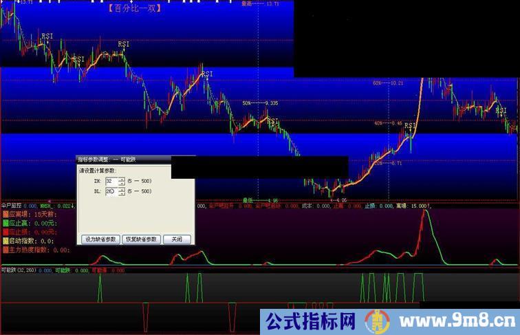 可能跌:IF(HHV(H,1)>=REF(HHV(H,ZH),1),1,0),color00FF00;;