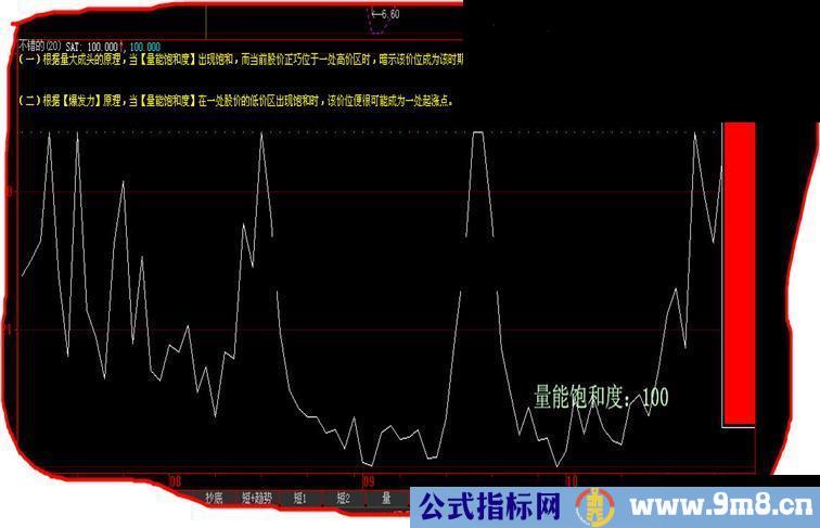 IF BARSTATUS=2 and (SAT) THEN BEGIN DRAWTEXTREL(700,800,'量能饱和度:'+NUMTOSTRN(SAT,0)),LINETHICK6,COLORccffcc;end;