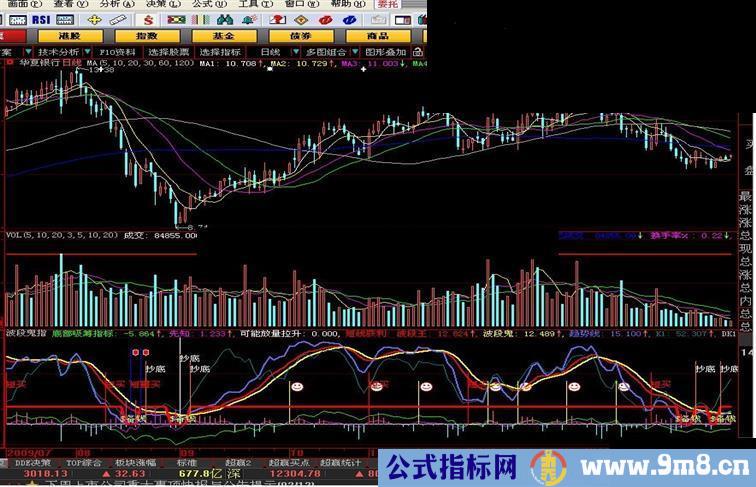 VAR2:=REF(LOW,1); VAR3:=SMA(ABS(LOW-VAR2),3,1)/SMA(MAX(LOW-VAR2,0),3,1)*100; VAR4:=EMA(IF(CLOSE*1.3,VAR3*10,VAR3/10),3); VAR5:=LLV(LOW,30); VAR6:=HHV(VAR4,30); VAR7:=IF(MA(CLOSE,58),1,0); VAR8:=EMA(IF(LOW<=VAR5,(VAR4+VAR6*2)/2,0),3)/618*VAR7; VAR9:=IF(VAR8>100,100,VAR8); STICKLINE(VAR9>-150,0,VAR9,0.3,0), COLORFF00FF; 底部吸筹指标:(CLOSE-MA(CLOSE,40))/MA(CLOSE,40)*100,COLOR00FF00; STICKLINE(CROSS(底部吸筹指标,-24),100,0,1,0), COLORFFFFFF; 先知: (CLOSE-MA(CLOSE,5))/MA(CLOSE,5)*100, COLORFF00FF; 可能放量拉升:IF(CROSS(底部吸筹指标,-24),1,0), COLORFFFFFF; 短线获利:STICKLINE(REF("KDJ.J",1)<0 AND "KDJ.J">0,60,0,2,0),COLOR0000FF; VARK1:=(CLOSE-LLV(LOW,27))/(HHV(HIGH,27)-LLV(LOW,27))*100; VARK2:=REVERSE(VARK1); VARK3:=SMA(VARK1,3,1); 波段王:SMA(VARK3,3,1), COLORRED,LINETHICK2; 波段鬼:SMA(波段王,2.5,1),COLORYELLOW,LINETHICK2; 趋势线: 3*SMA((CLOSE-LLV(LOW,27))/(HHV(HIGH,27)-LLV(LOW,27))*100,5,1)-2*SMA(SMA((CLOSE-LLV(LOW,27))/(HHV(HIGH,27)-LLV(LOW,27))*100,5,1),3,1),COLORFF6666,LINETHICK2; RSV9:=(CLOSE-LLV(LOW,9))/(HHV(HIGH,9)-LLV(LOW,9))*100; K1:SMA(RSV9,3,1); DK1:K1-REF(K1,1),COLORSTICK; 出手就赢:IF(DK1>7 AND REF(DK1,1)<0 AND (DK1-REF(DK1,1))>9,50,0), STICK,COLORYELLOW;DRAWICON(出手就赢>0,50 ,1); STICKLINE( CROSS(趋势线,10),0,73,3,0), COLOR3366FF; DRAWTEXT(IF(CROSS(趋势线,10),100,0),68,'抄底'),COLORWHITE ; DRAWTEXT(IF(CROSS(10,趋势线),1,0), 10,'$备钱'),COLOR33FFCC; DRAWTEXT(REF("KDJ.J",1)<0 AND "KDJ.J">0,50,'短买'),COLORRED ; DRAWTEXT(CROSS(底部吸筹指标,-24),80,'抄底'),COLORWHITE ; RSV:=(((CLOSE - LLV(LOW,9)) / (HHV(HIGH,9) - LLV(LOW,9))) * 100); 短期底部:=LLV(OPEN,30); K:=SMA(RSV,3,1); D:=SMA(K,3,1); J:=((3 * K) - (2 * D)); AA10:=MA(CLOSE,10); AA12:=MA(CLOSE,12); BB10:=((ATAN((AA10 - REF(AA10,1))) * 3.1416) * 10); BB12:=((ATAN((AA12 - REF(AA12,1))) * 3.1416) * 10); MA13:=MA(CLOSE,13); VARB:=(((CLOSE - MA(CLOSE,6)) / MA(CLOSE,6)) * 100); VARC:=(((CLOSE - MA(CLOSE,12)) / MA(CLOSE,12)) * 100); VARD:=(((CLOSE - MA(CLOSE,24)) / MA(CLOSE,24)) * 100); VARE:=(((VARB + (2 * VARC)) + (3 * VARD)) / 6); VARF:=MA(VARE,3); STICKLINE((CROSS(J,0) AND (VARF <= (0 - 7))),0,88,2,0),COLORBLUE; DRAWICON((CROSS(J,0) AND (VARF <= (0 - 7))),88,9); VARO2:=(CLOSE-LLV(LOW,26))/(HHV(HIGH,26)-LLV(LOW,26))*100; VARO3:=SMA(SMA(VARO2,3,1),3,1); VARO4:=EMA(VARO3,5); VARO5:=LLV(LOW,26); VARO6:=HHV(HIGH,34); VARO7:=EMA((CLOSE-VARO5)/(VARO6-VARO5)*4,4)*25; STICKLINE(CROSS(VARO4,10) AND VARO4>10,25,0,1,0),COLORYELLOW; 建仓区: IF((VARO7<10),0,20),LINETHICK3 ,COLORred;