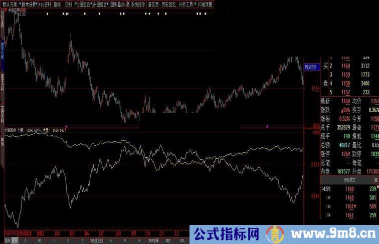 说明:这个公式难定量,只是凭目视判断:当“个股”线与“大盘”线纠缠在一起时,大底区域即出现了。这样的个股可以选为自选股,配合我的其他长线公式就可以买入了。大家可以自己比较判断。