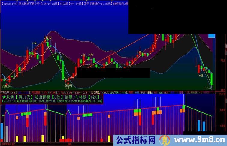 总之我们用ZIG(3,10)不管涨跌只要达到10%以上就不会再飘逸了.咱们进一层说在转折以后涨跌幅度没超过10%以前都有可能产生飘逸---------—就是说ZIG(3,10)有涨跌幅10%以内的涨跌趋势的不确定性--------------------.正因为这个道理咱们在主图.幅图.用文字.用图形.都编辑了补助信号.你不可以【视而不见】.