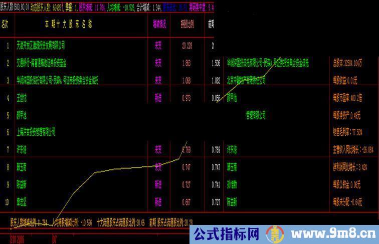 DRAWTEXTREL(5,35,'名次'),COLOR00FFFF;DRAWTEXTREL(120,35,'本 期 十 大 股 东 名 称'),COLOR00FFFF;DRAWTEXTREL(405,35,'增减情况'),COLORFF00FF;DRAWTEXTREL(478,35,'持股比例'),Color8080FF;DRAWTEXTREL(550,35,'前期比例'),colorwhite;DRAWTEXTREL(650,35, '前 期 十 大 股 东 名 称'),COLOR00FFFF;DRAWTEXTREL(880,35,'股票名称:'+'【'+STKLABEL+' '+STKNAME+'】'),COLOR00FFFF;