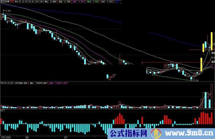 2、说明:公式的设计非常简单,就是利用5日线的角度来衡量资金的进出,红色,资金流入,篮色在下,资金流出。