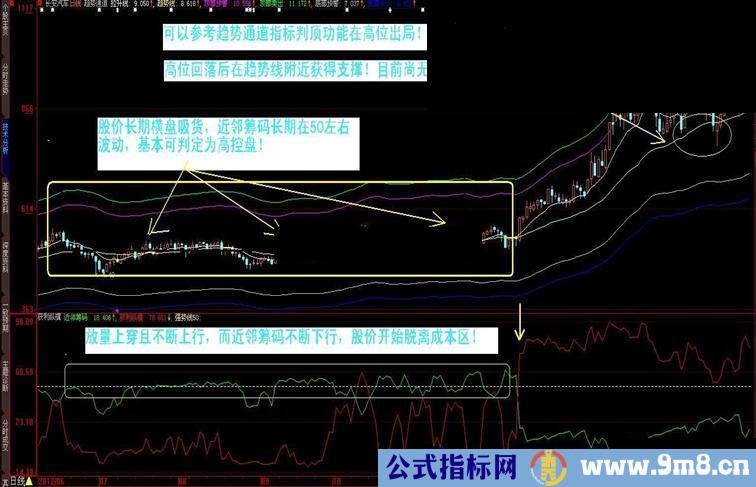 本指标由近邻筹码(即股价上下15%空间内的筹码比例)和获利纵横组成,是监控高控盘股票启动和高位出货的利器。