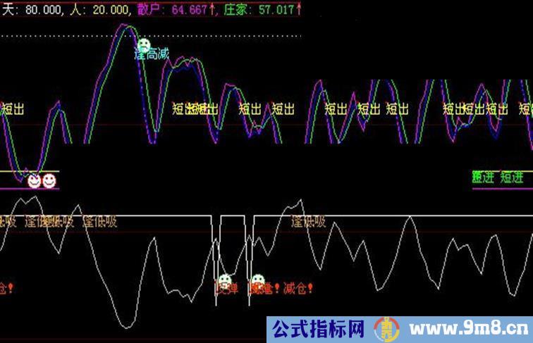 DRAWTEXT(CROSS(庄家,散户) AND 散户>70,75,'逢高减'),COLORFFFF33;
