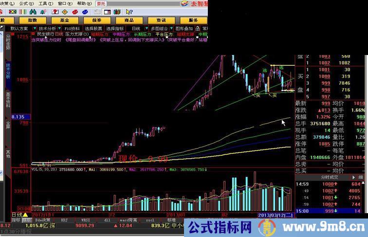 中期压力:DRAWLINE(A15,HIGH,A13,HIGH,1),colorMagenta;