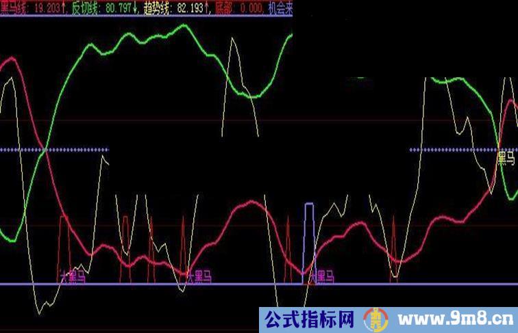 DRAWTEXT(CROSS(趋势线,黑码线)AND 黑码线>20 AND 黑码线
