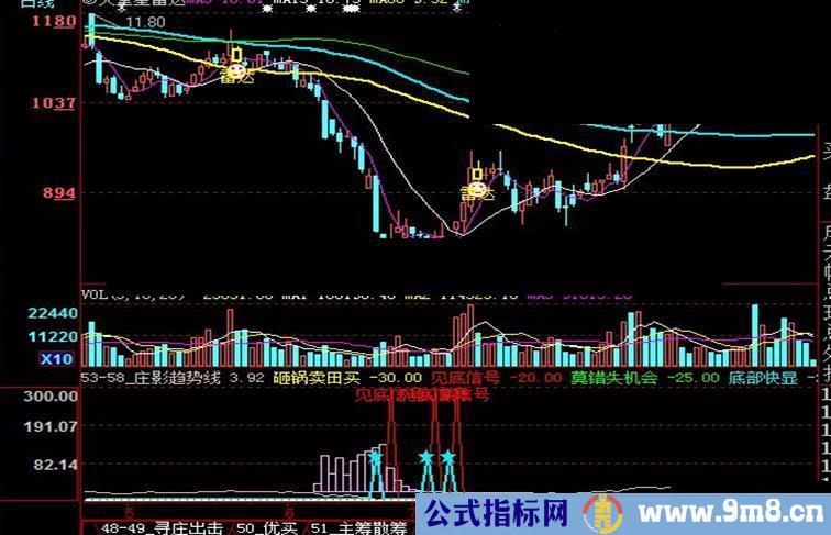 底部快显:if(cross(-20,趋势线),100,-20),linethick2,colorf0f000;