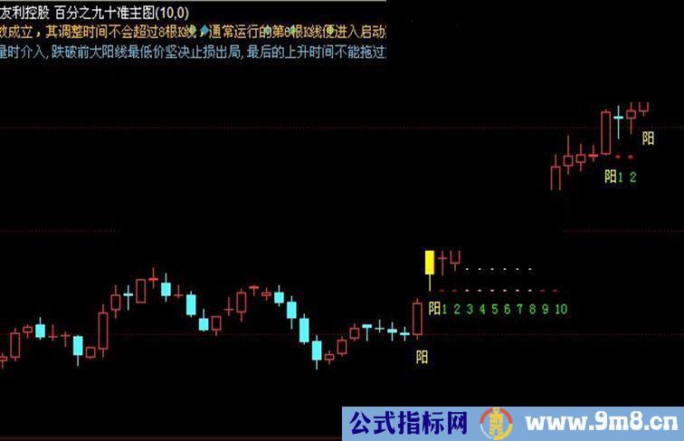 DRAWTEXT(BARSLAST(单阳)=9 AND 单阳不破,低不破价*0.98,'9'),colorgreen;