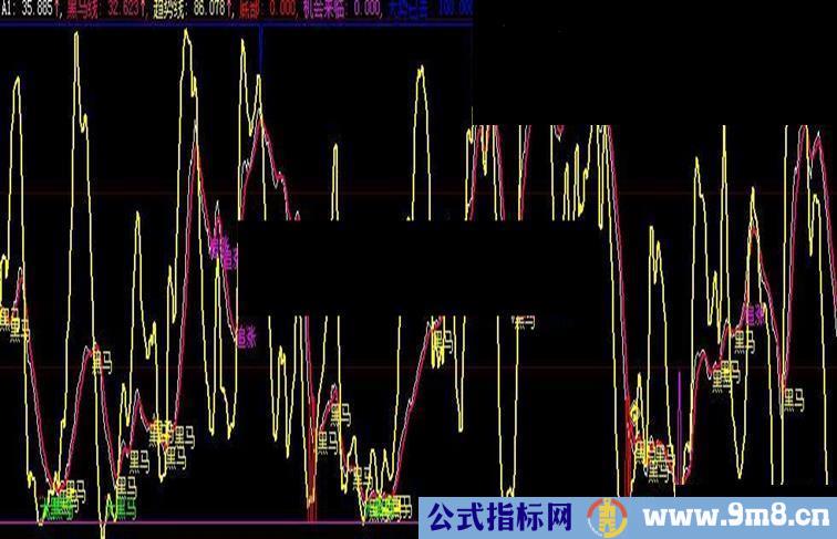 大势已去:IF(CROSS(黑码线,A1)AND 黑码线>70 AND 趋势线>80,90,100),COLORFF0000;