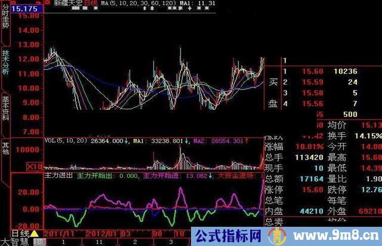 主力开始进: IF(V4>=0,V4,0),COLORFF00FF,LINETHICK2;