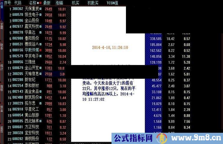 本指标在开盘后就能够显示全天都为固定值的攻击数据,但要使用到全推的分时数据,使用我提供的全推账号和密码就能够在开盘后查看到竞价攻击力度(系统参数设置中的要把分时竞价显示设置为自动)。该指标所示值为主力在竞价时的攻击力度,很大程度上决定了个股当天的走势。其使用方法为:1. 排序值越往前的表示主力在当天攻击力度意原和强度越大。2. 可用于抓涨停。 3. 攻击力度很大而且在连续拉高多天后一般意味着主力第二天出货。 4. 股价在日线上开始突破时如果发现此指标的攻击力度值很大,则表示该股正式启动,后期上涨潜力巨大
