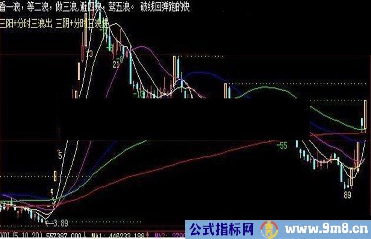 drAWTEXTABS(0,60,'三阳+分时三浪出 三阴+分时三浪进'),LINETHICK1,coloryellow,layer0;