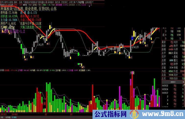 1.在每天的成交量柱上用不同的色柱分类显示机构、大户、中户和散户的净买入量。每天的量柱上最多只会出现三种颜色,因为至少有一家是净卖出的。机构为大红色柱,大户为玖瑰红色柱,中户为黄色柱,散户为绿色柱。