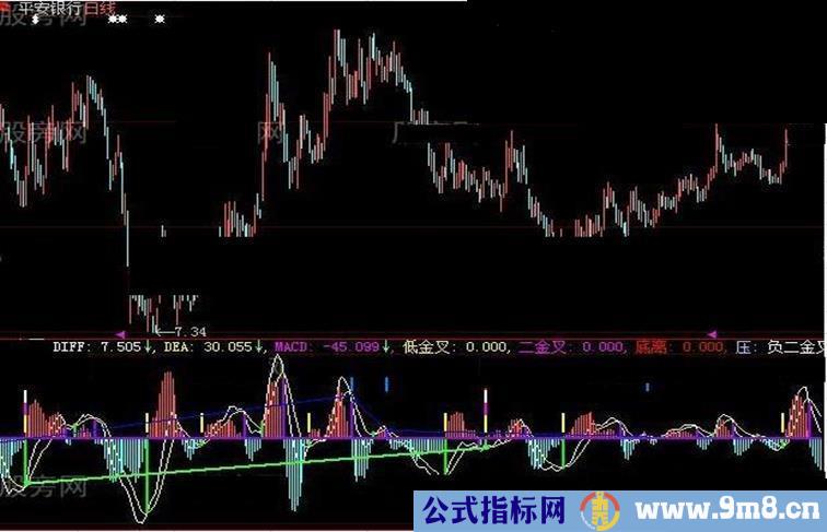 低金叉:IF(CROSS(DIFF,DEA) AND DIFF<-0.1,15,0),COLORYELLOW,LINETHICK0;