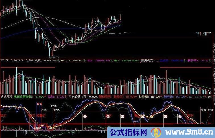 VAR2:=REF(LOW,1); VAR3:=SMA(ABS(LOW-VAR2),3,1)/SMA(MAX(LOW-VAR2,0),3,1)*100; VAR4:=EMA(IF(CLOSE*1.3,VAR3*10,VAR3/10),3); VAR5:=LLV(LOW,30); VAR6:=HHV(VAR4,30); VAR7:=IF(MA(CLOSE,58),1,0); VAR8:=EMA(IF(LOW<=VAR5,(VAR4+VAR6*2)/2,0),3)/618*VAR7; VAR9:=IF(VAR8>100,100,VAR8); STICKLINE(VAR9>-150,0,VAR9,0.3,0), COLORFF00FF; 底部吸筹指标:(CLOSE-MA(CLOSE,40))/MA(CLOSE,40)*100,COLOR00FF00; STICKLINE(CROSS(底部吸筹指标,-24),100,0,1,0), COLORFFFFFF; 先知: (CLOSE-MA(CLOSE,5))/MA(CLOSE,5)*100, COLORFF00FF; 可能放量拉升:IF(CROSS(底部吸筹指标,-24),1,0), COLORFFFFFF; 短线获利:STICKLINE(REF("KDJ.J",1)<0 AND "KDJ.J">0,60,0,2,0),COLOR0000FF; VARK1:=(CLOSE-LLV(LOW,27))/(HHV(HIGH,27)-LLV(LOW,27))*100; VARK2:=REVERSE(VARK1); VARK3:=SMA(VARK1,3,1); 波段王:SMA(VARK3,3,1), COLORRED,LINETHICK2; 波段鬼:SMA(波段王,2.5,1),COLORYELLOW,LINETHICK2; 趋势线: 3*SMA((CLOSE-LLV(LOW,27))/(HHV(HIGH,27)-LLV(LOW,27))*100,5,1)-2*SMA(SMA((CLOSE-LLV(LOW,27))/(HHV(HIGH,27)-LLV(LOW,27))*100,5,1),3,1),COLORFF6666,LINETHICK2; RSV9:=(CLOSE-LLV(LOW,9))/(HHV(HIGH,9)-LLV(LOW,9))*100; K1:SMA(RSV9,3,1); DK1:K1-REF(K1,1),COLORSTICK; 出手就赢:IF(DK1>7 AND REF(DK1,1)<0 AND (DK1-REF(DK1,1))>9,50,0), STICK,COLORYELLOW;DRAWICON(出手就赢>0,50 ,1); STICKLINE( CROSS(趋势线,10),0,73,3,0), COLOR3366FF; DRAWTEXT(IF(CROSS(趋势线,10),100,0),68,'抄底'),COLORWHITE ; DRAWTEXT(IF(CROSS(10,趋势线),1,0), 10,'$备钱'),COLOR33FFCC; DRAWTEXT(REF("KDJ.J",1)<0 AND "KDJ.J">0,50,'短买'),COLORRED ; DRAWTEXT(CROSS(底部吸筹指标,-24),80,'抄底'),COLORWHITE ; RSV:=(((CLOSE - LLV(LOW,9)) / (HHV(HIGH,9) - LLV(LOW,9))) * 100); 短期底部:=LLV(OPEN,30); K:=SMA(RSV,3,1); D:=SMA(K,3,1); J:=((3 * K) - (2 * D)); AA10:=MA(CLOSE,10); AA12:=MA(CLOSE,12); BB10:=((ATAN((AA10 - REF(AA10,1))) * 3.1416) * 10); BB12:=((ATAN((AA12 - REF(AA12,1))) * 3.1416) * 10); MA13:=MA(CLOSE,13); VARB:=(((CLOSE - MA(CLOSE,6)) / MA(CLOSE,6)) * 100); VARC:=(((CLOSE - MA(CLOSE,12)) / MA(CLOSE,12)) * 100); VARD:=(((CLOSE - MA(CLOSE,24)) / MA(CLOSE,24)) * 100); VARE:=(((VARB + (2 * VARC)) + (3 * VARD)) / 6); VARF:=MA(VARE,3); STICKLINE((CROSS(J,0) AND (VARF <= (0 - 7))),0,88,2,0),COLORBLUE; DRAWICON((CROSS(J,0) AND (VARF <= (0 - 7))),88,9); VARO2:=(CLOSE-LLV(LOW,26))/(HHV(HIGH,26)-LLV(LOW,26))*100; VARO3:=SMA(SMA(VARO2,3,1),3,1); VARO4:=EMA(VARO3,5); VARO5:=LLV(LOW,26); VARO6:=HHV(HIGH,34); VARO7:=EMA((CLOSE-VARO5)/(VARO6-VARO5)*4,4)*25; STICKLINE(CROSS(VARO4,10) AND VARO4>10,25,0,1,0),COLORYELLOW; 建仓区: IF((VARO7<10),0,20),LINETHICK3 ,COLORred;