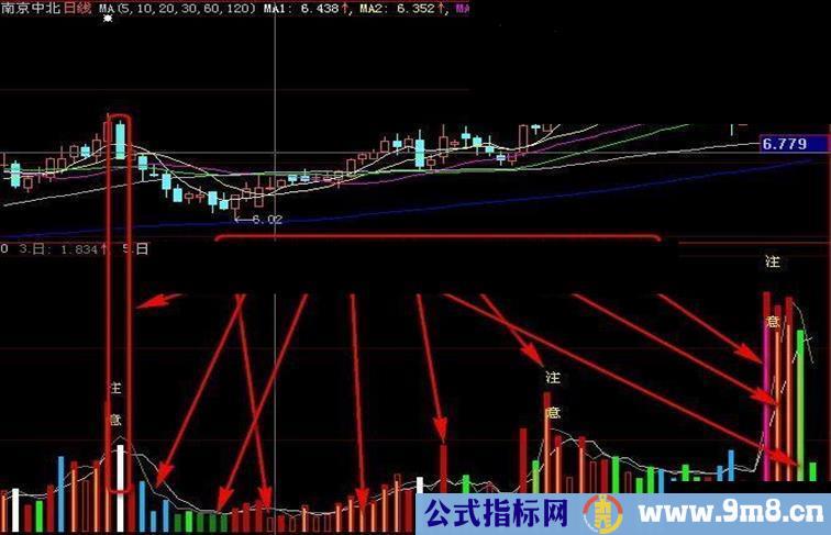 注意:DRAWTEXT(FILTER((量能>2 AND REF(量能>1 ,1 ) AND 换手>4 OR 换手>5) AND (开心看量>0 AND 开心看量>VMA1) , 3),VAR1*1.15 ,'注' ),COLORYELLOW;