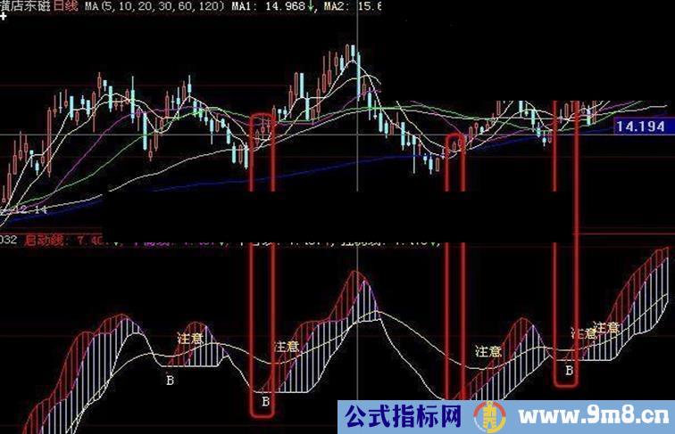 启动线:SUM(EMA((C+L)/2,2),5)/10.158,COLORRED;