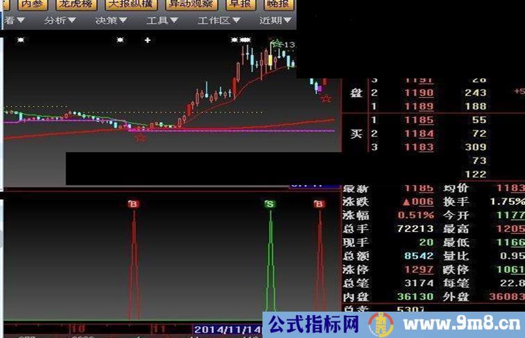 本指标是未来函数,作买卖点参考是否有用?贤者见贤。 DRAWGBKLAST(v>1,STRIP(RGB(00,0,0),RGB(90,90,90),0)); 买入:CROSS(ZIG(3,8),REF(ZIG(3,8),1)),colorred; 卖出:CROSS(REF(ZIG(3,10),1),ZIG(3,10)),colorgreen; DRAWBMP((买入> 0),1.1,'B.bmp'),ALIGN1; DRAWBMP((卖出> 0),1.1,'S.bmp'),ALIGN1;