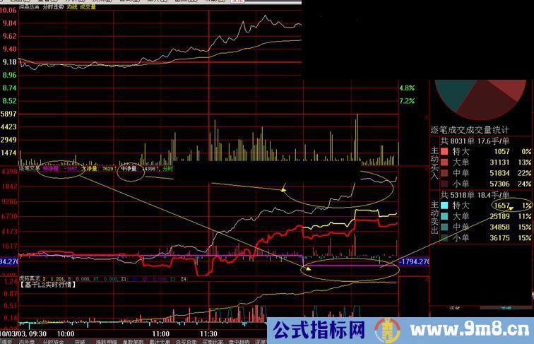 2:指标主要用于分时盯盘(帮助看盘口主动成交的各类成交变化趋势,类似与逐笔龙虎看盘),也可用于分笔成交看盘;