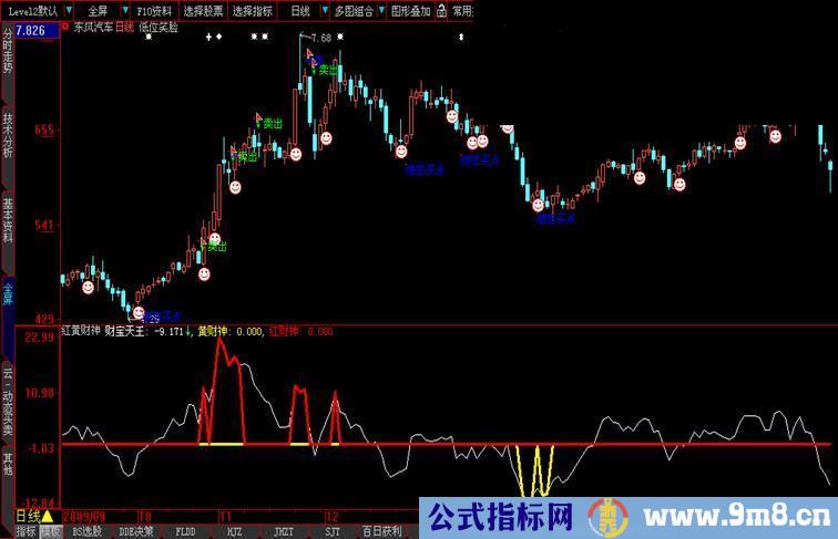 红财神发卖出信号,财宝天王(白线)继续上升时,可继续持仓,向下转向时即刻卖出,应该是一段大跌的开始,