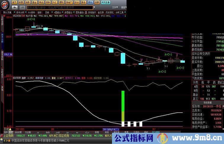 jd1:=Var2A>20000 AND CLOSE jd2:=(CLOSE-Var16)/Var16*100 STICKLINE(jd1,0.1,0.3,4.6,0),color00cc99; STICKLINE(jd2,0,0.1,4.6,0),colorwhite; STICKLINE(jd1 and jd2,0.3,0.7,4.5,0),color00ff00; qs1:=SMA((CLOSE-LLV(LOW,27))/(HHV(HIGH,27)-LLV(LOW,27))*100,5,1); 趋势:ema(3*qs1-2*SMA(qs1,3,1),5)/100,linethick2; 圣指:IF((REF(CLOSE,13)-CLOSE)/REF(CLOSE,13)*100>15 AND SUM(VOL/CAPITAL,13)*100<18 AND VOL/CAPITAL*100<2.5 AND (LC-CLOSE)/LC*100<8,0.8,0.1),colorFFCC99;{金指63} v2:=(CLOSE-LC)/LC*100; v3:=MA(VOL,2)/MA(VOL,10); v4:=VOL/CAPITAL; tct:=0.015*V2-0.124*V3+17.5*V4; tct1:=hhv(tct,250)-0.4; 量能:if(tct>tct1,tct1-tct+1,1),coloryellow; drawicon(filter(0.0015*V2-0.0124*V3+1.7461*V4>0.148,10),0.6,3); 买:filter(-0.08473268*V2+0.10052872*V3+5.20138076*V4+0.45692105<0,3)*0.8,linethick2,colorff00ff; b1:=(CLOSE-MA(CLOSE,27))/MA(CLOSE,27)<-0.16; 品股:b1*0.5,colorred; STICKLINE(b1,0.15,0.5,3.5,0),colorred; 金品:filter(圣指=0.8 and b1 and jd1 and jd2,2); STICKLINE(金品,0,1,6,0),colorred;