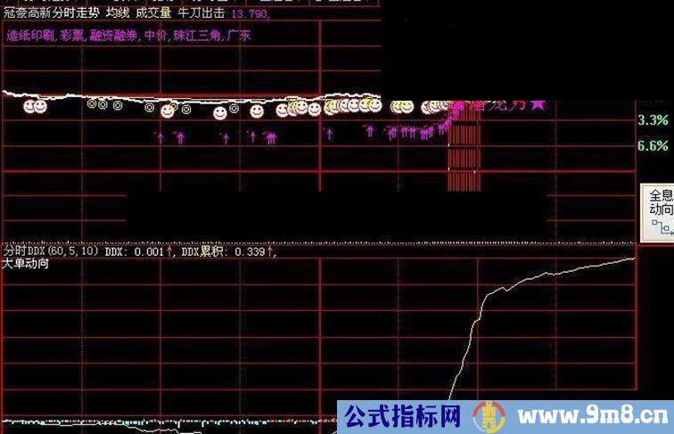 这是我根据千钧老师的作品,再结合分式资金、量能,自编的比较满意的一个指标公式,在拉升前出现的笑脸和向上的箭头越多越好,一旦出现“倚天剑”或“狂牛”,行情就来了。当然要结合k线、基本面和题材。这样胜算更大