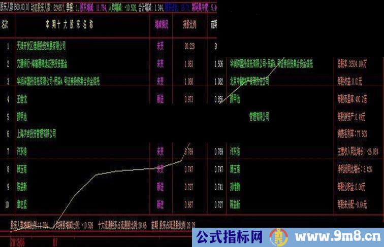 DRAWTEXTREL(5,35,'名次'),COLOR00FFFF;DRAWTEXTREL(120,35,'本 期 十 大 股 东 名 称'),COLOR00FFFF;DRAWTEXTREL(405,35,'增减情况'),COLORFF00FF;DRAWTEXTREL(478,35,'持股比例'),Color8080FF;DRAWTEXTREL(550,35,'前期比例'),colorwhite;DRAWTEXTREL(650,35, '前 期 十 大 股 东 名 称'),COLOR00FFFF;DRAWTEXTREL(880,35,'股票名称:'+'【'+STKLABEL+' '+STKNAME+'】'),COLOR00FFFF;
