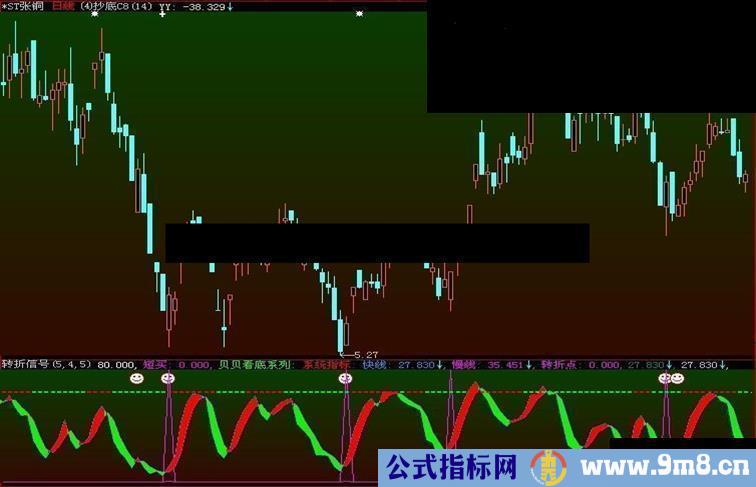 转折点:if(cross(快线,慢线) and 慢线<40 and REF(J,1)<0 AND J>0,100,0),linethick1,colorf00ff0;