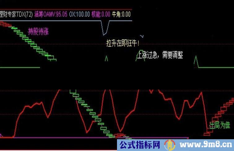 DRAWTEXT(VAR27 AND COUNT(VAR27,30)=1,90,'持股待涨'),COLORFF00FF;