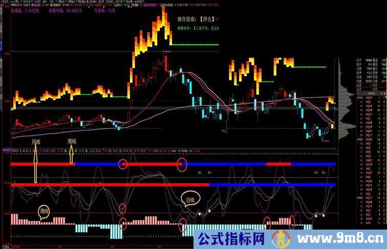 (2)第2根横条是月线级别的KDJ情况,红色表示大级别的反弹或反转,一般是反转的行情,蓝色表示大级别的回调或反转,一般是行情反转,对于做长线来讲,看月线指标。