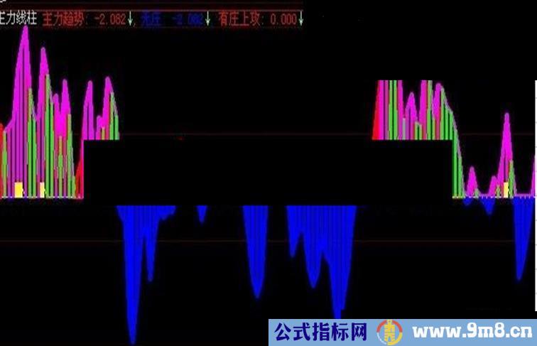 有庄上攻:IF(主力趋势>REF(主力趋势,1) AND 主力趋势>0,主力趋势,0),COLORRED,LINETHICK4;;
