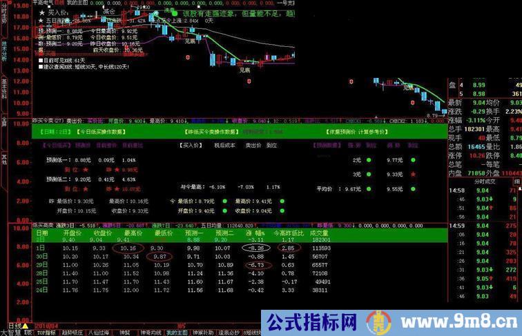 第二天(昨天):依据 “预测股价”公式的“最低价",配合“分时主图”公式,以接近“最低价”买入。