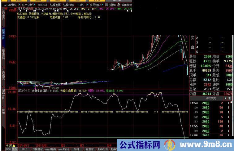 input:N(34,1,500),M(3,1,500); 大盘生命指数:(EMA(((100 * (CLOSE - LLV(LOW,N))) / (HHV(HIGH,N) - LLV(LOW,N))),M) / 4); 大盘生命量能:IF((大盘生命指数 > 23.16),大盘生命指数,15),CIRCLEDOT; 强势:23; 生命线:3;