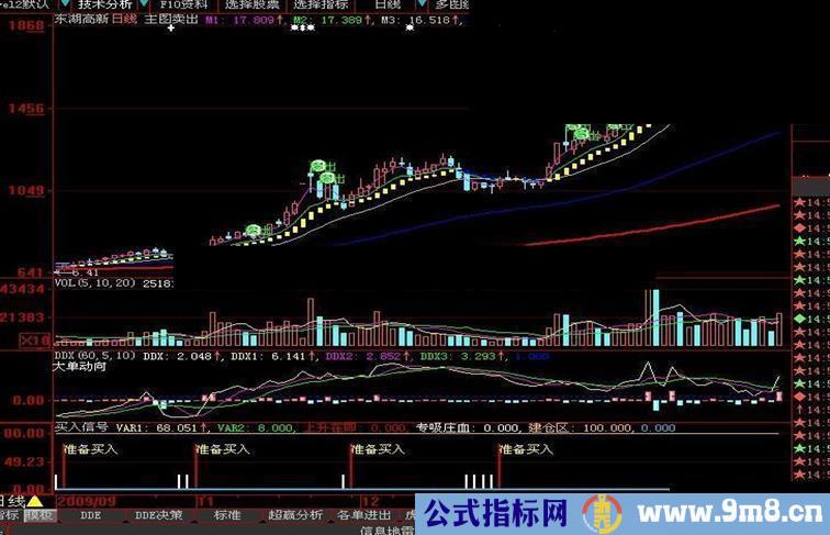 二个指标配合使用说明:如果当日K线上主图指标出现了黄色的买入信号后,我们可以不必急着去买入,而是看一下副图指标,如果下面的副图指标也相对的出现了买入信号后,我们则可以大胆的全仓介入,坐等着主力拉升就可以了,成功率近100%。