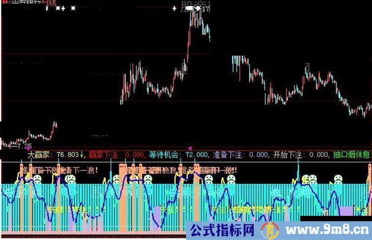 等待机会: IF(CROSS(MA(大赢家,9),大赢家) AND 大赢家>70,110,72),LINESTICK , colorcyan;