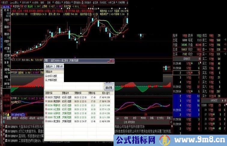 今日中午编制完成加入预警立即就有股票报警,下图前两个图是黄金线买点(主图上K线下有红色向上箭头),后一个图是KDJ共振买点(KDJ共振副图有红色向上箭头)预报结果。一般KDJ共振买点先于黄金线,激进者可按KDJ共振买点买入股票,稳健者可按黄金线买点买入股票。仅供参考。下载后望回复,使用后认为好的请推荐。