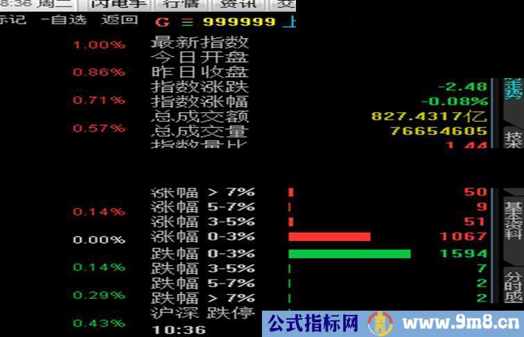 通达信目前指数每天有一个当前市场的统计的功能,显示各个档的数量,由于通达信的统计功能太弱了,所以只能借助大智慧,大智慧的横向统计功能我就不介绍了,坛子里面有介绍,具体方法大家自己找找。下面附上我的截图和引用所需要的公式。 统计做出来后发现大趋势上的研判是很准确的,就是在跌幅 -5%---- -7%这个档的数据和别的差距好大,不知道是什么原因