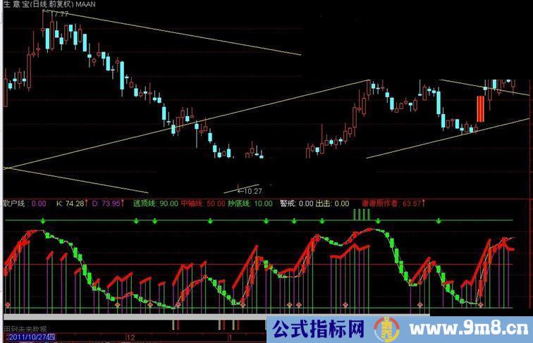 趋势线:=LLV(阶段底部,1),COLORWHITE,LINETHICK0;