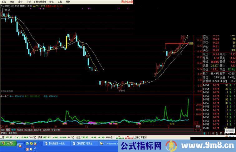 个股:EMA(100*(CLOSE-LLV(LOW,9))/(HHV(HIGH,9)-LLV(LOW,9)),3)*500,COLORLIBLUE,LINETHICK3;