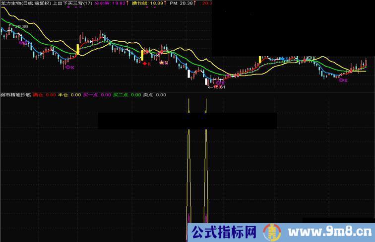 跟大家共享一个弱市抄底指标,别处淘来,在弱市情形,配合其他指标操作,可靠性较高。该指标给出买卖提示。