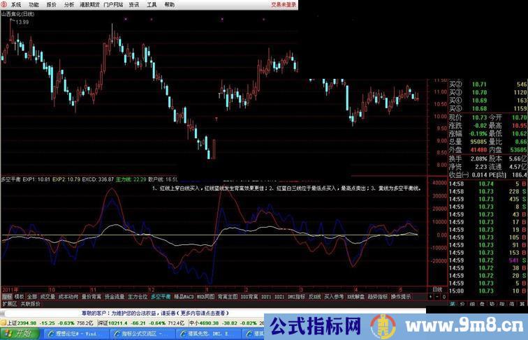DRAWTEXT_FIX(1,0.99,0.01,1,'1、红线上穿白线买入,红线蓝线发生背离效果更佳;2、红蓝白三线位于最低点买入,最高点卖出;3、黄线为多空平衡线。');